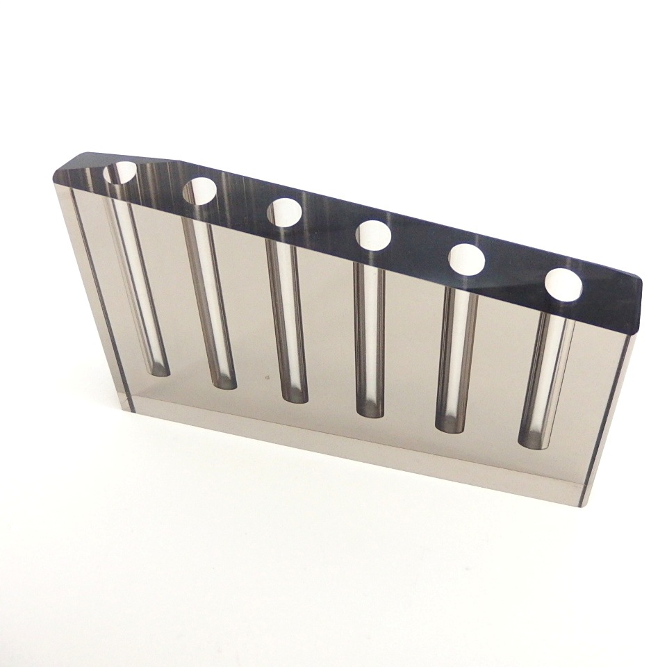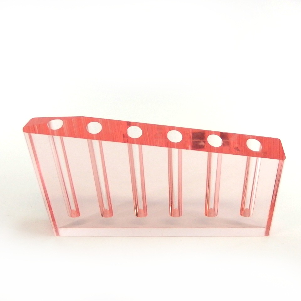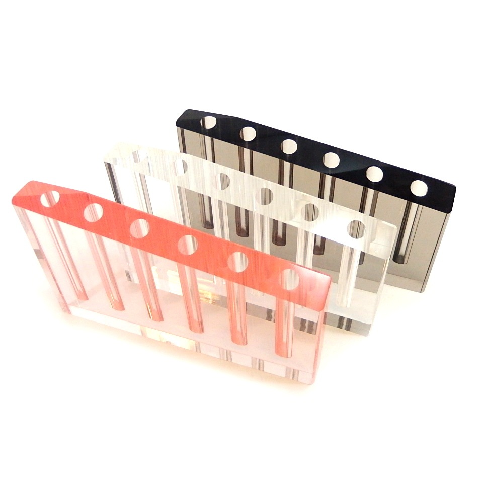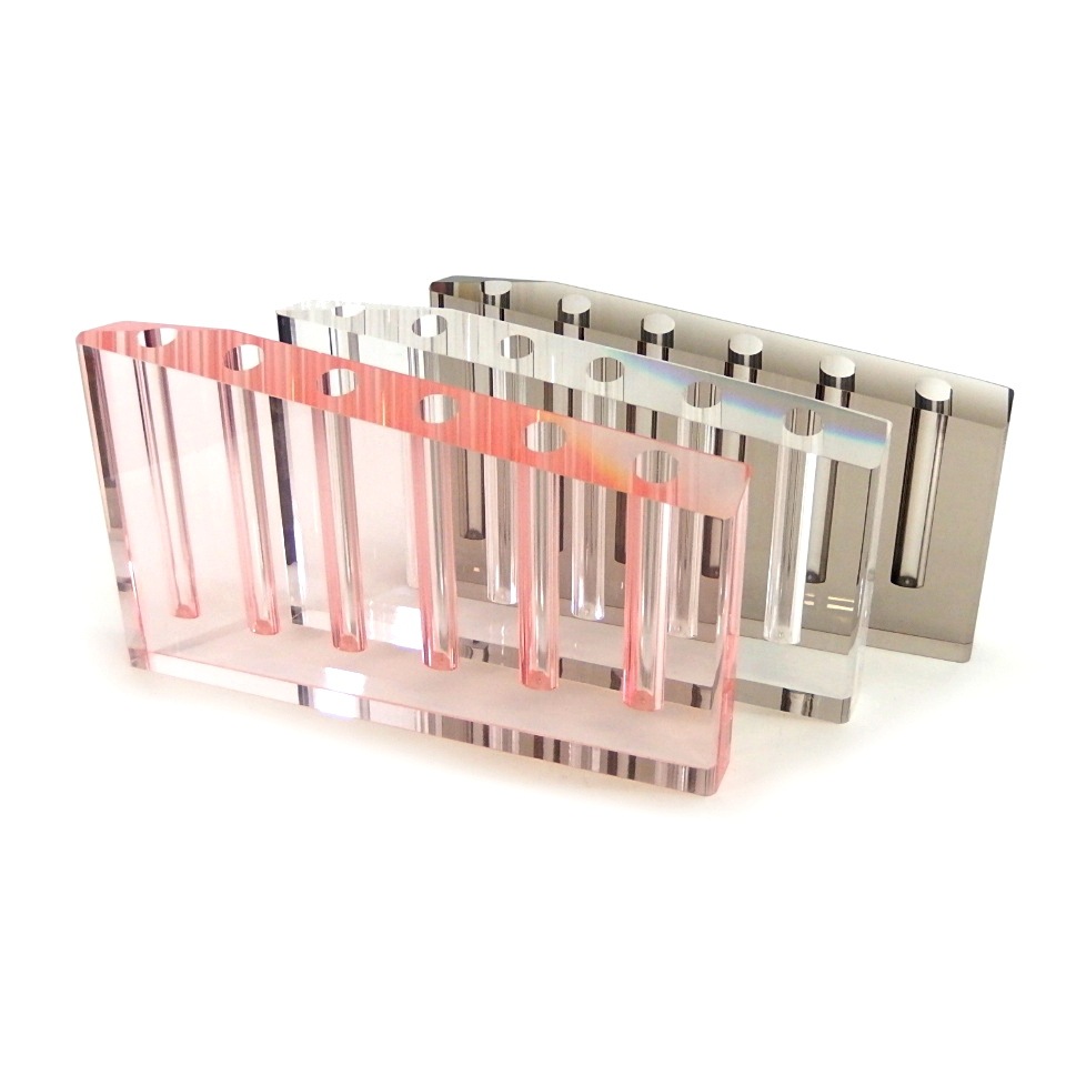 厚さ3センチのアクリルに9穴、6穴、2穴、1穴の挿し口を作り花器にしました。